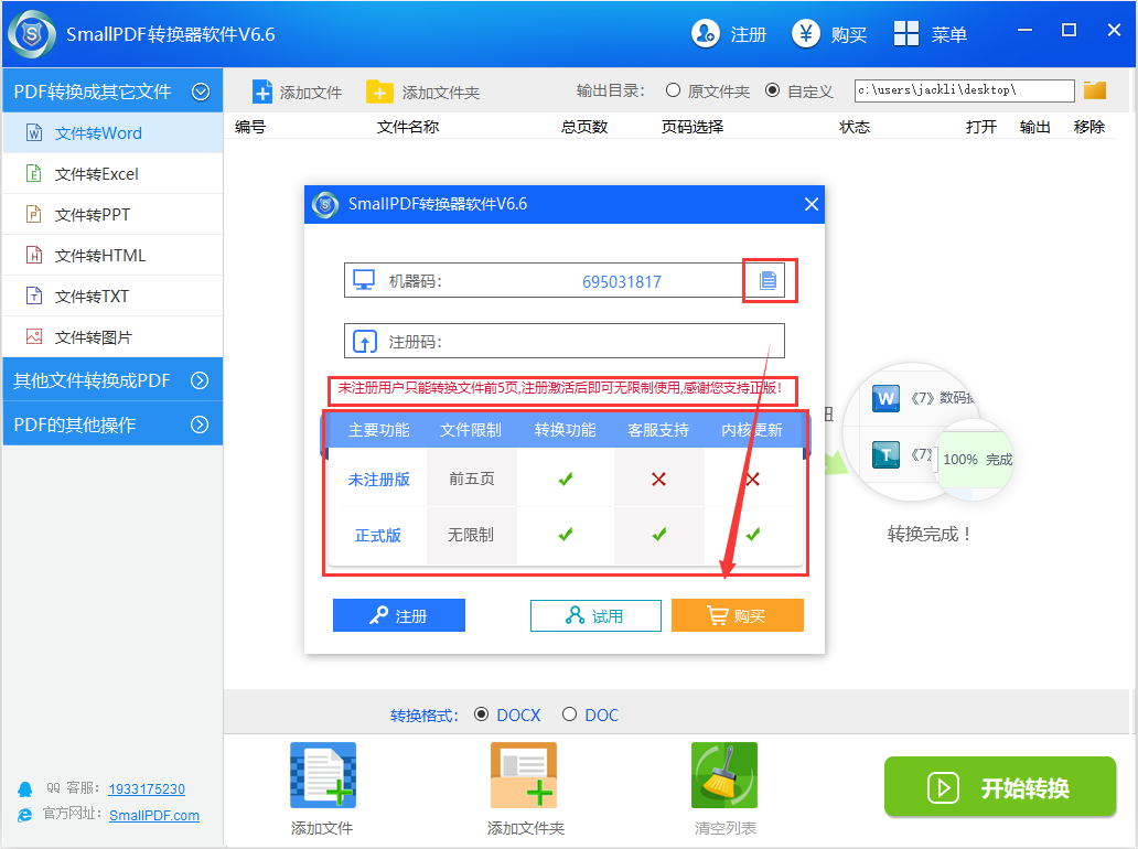 可以看到我们在使用免费版的smallpdf转换器转换文件时,只能转换文件的前五页,受到极大的限制非常的不方便。而且没有客服支持和内核更新,那当我们使用pdf转换器遇到问题时就不能有效的咨询客服并寻求到解决,而且内核的更新可以大大提高我们文件的转换速度,有效的提高我们的工作效率。所以看完上面免费版与完整版的对比后你,还不去注册并使用完整版的smallpdf转换器吗?
